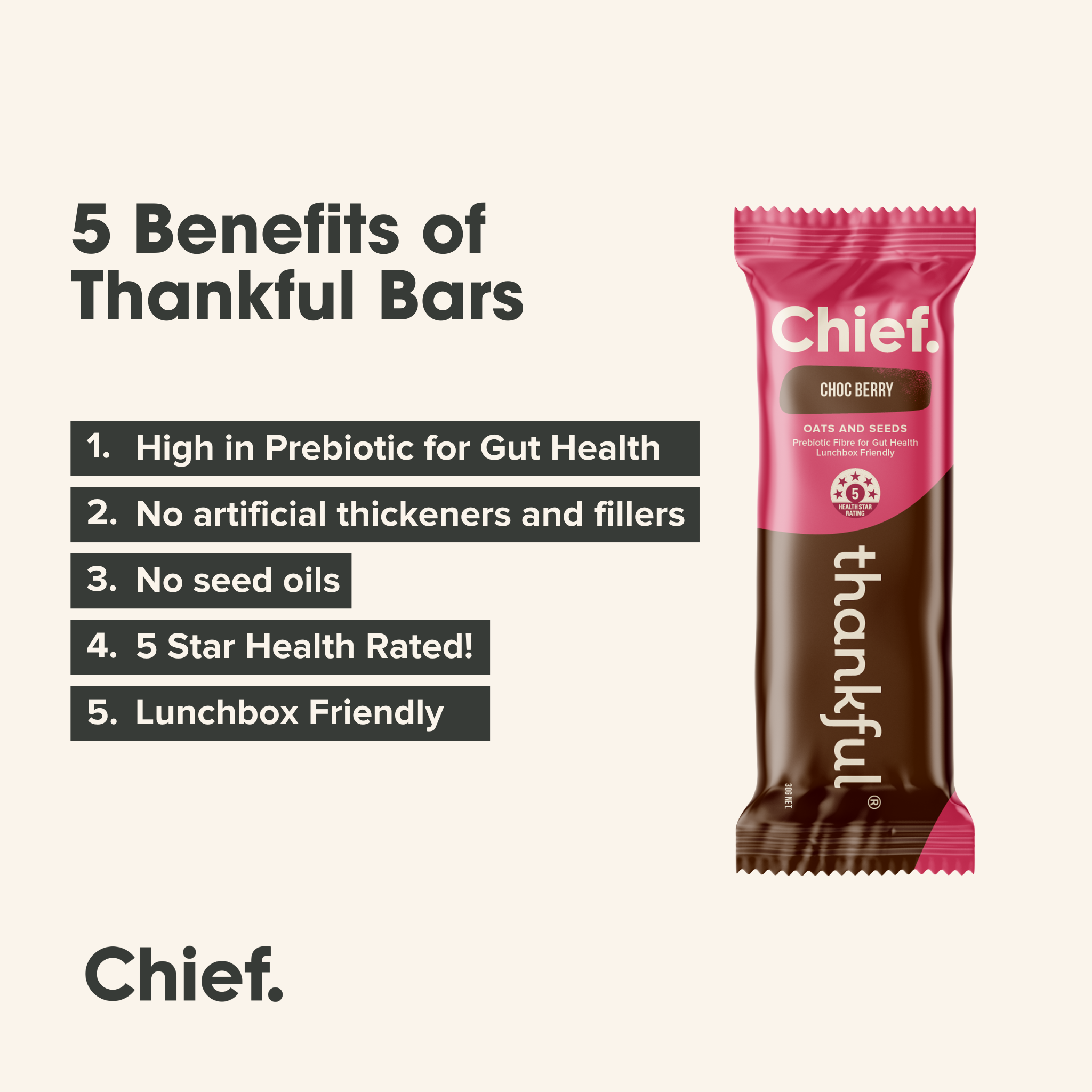 Thankful Bar is a collaboration between Thankful.org and Chief Nutrition, to raise awareness about the benefits of gratitude on health. Each bar you buy helps support Thankful in their mission to create positive social impact. Scan the QR code on pack to learn more and bring more thankful moments into your life!