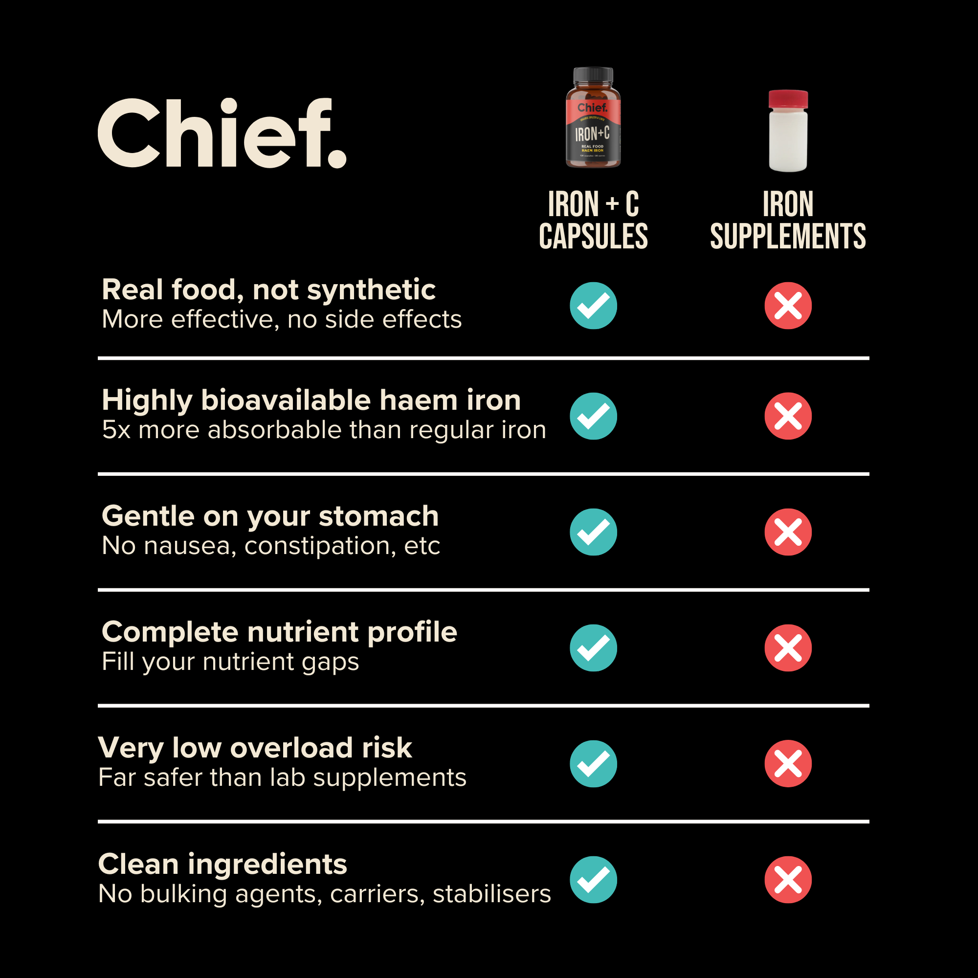 Synthetic iron supplements are typically made by industrially processing iron salts like ferrous sulfate, blending them with synthetic vitamin C and chemical excipients. They aren't as easily absorbed and may cause side effects like nausea and constipation. Chief IRON+C is made from real food ingredients, which deliver iron alongside its natural cofactors like B vitamins and minerals - as nature intended.