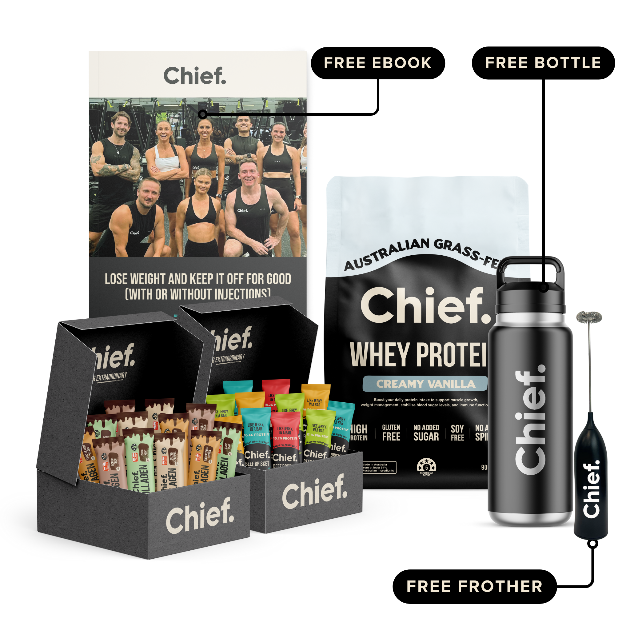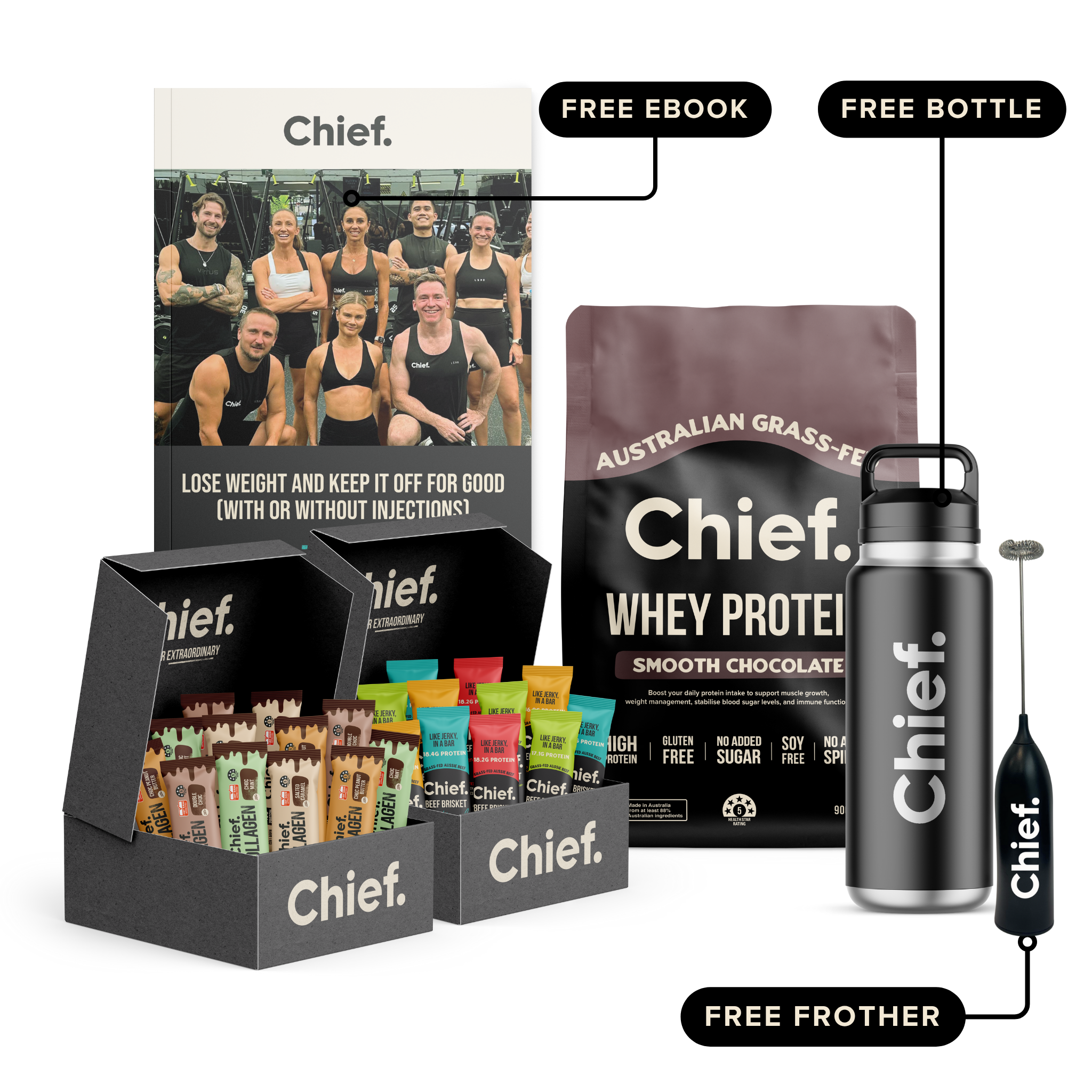 - Free Rechargeable Electric Frother ($19.95 value) to mix your protein powder